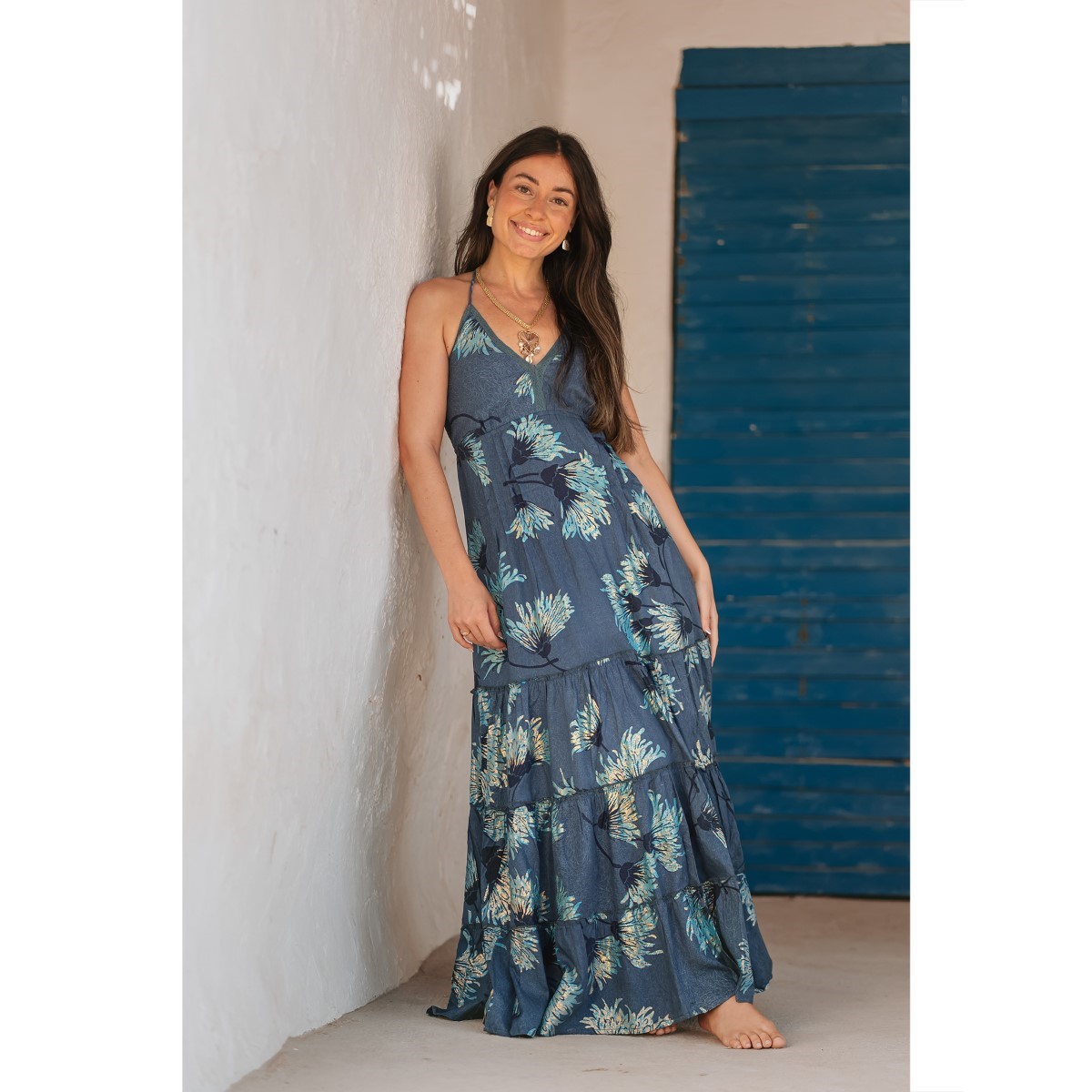 Vestido largo estampado, espalda elástica, posibilidad de modificar tirantes de posicion.